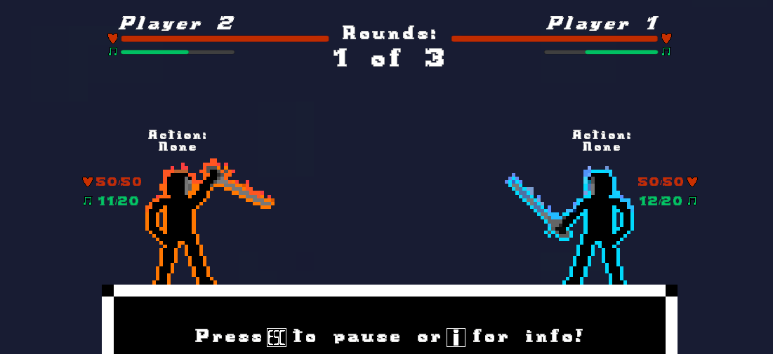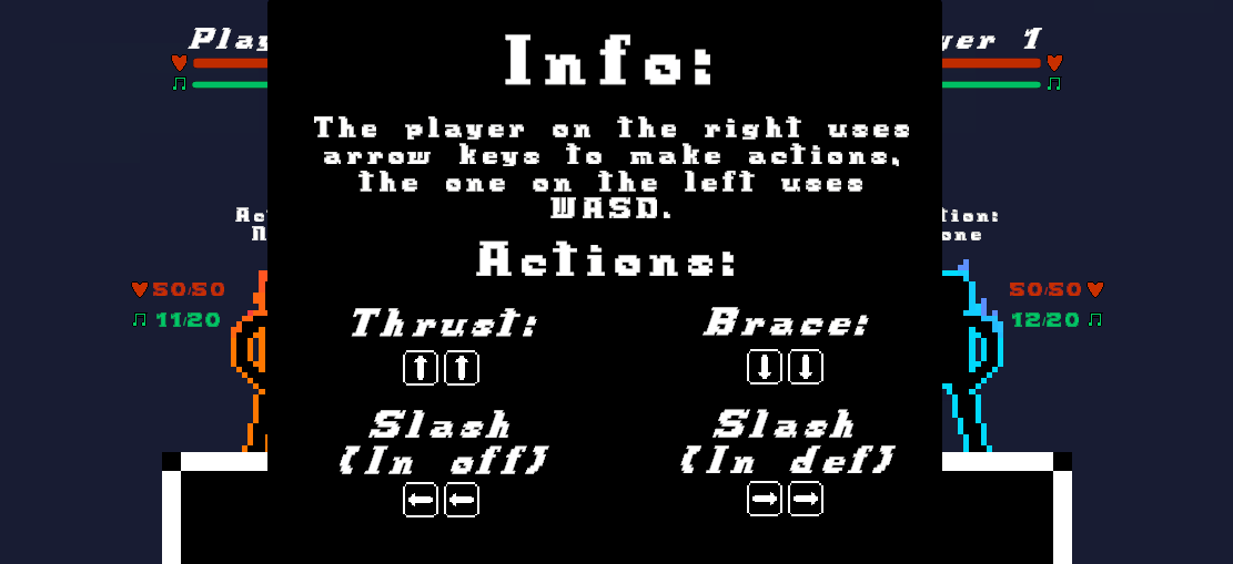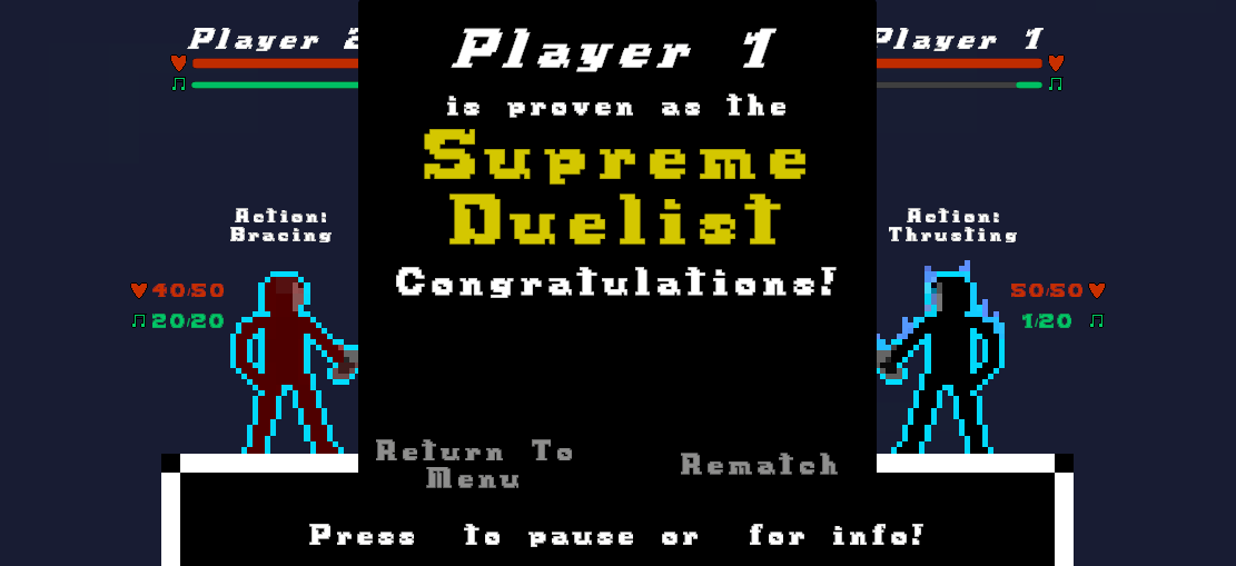 The Duelist is a turn based 1v1 fighting game inspired by the Bolognese school of fencing set in early 16th ceutry. Actions resolve simultaneusly, whoever is the faster one attacks and the other player is given a chance to defend themselves via a quick time event. The game consists of 3-9 rounds of combat, a round ends when a player is hit, a point is awarded to the player who landed the hit, whoever has the most points when te last round ends, wins. Players can also run out of HP, resulting in the victory of the opposing player.